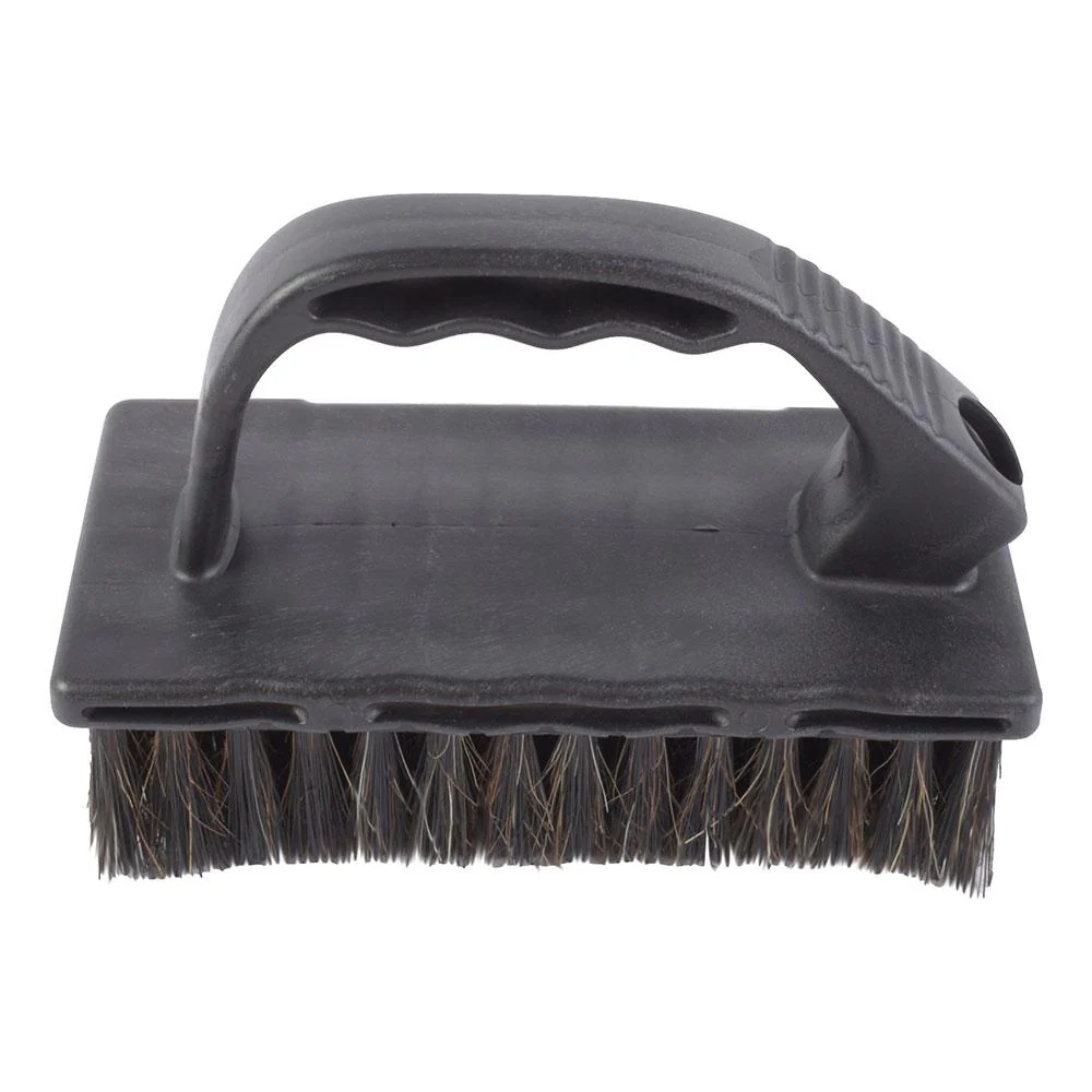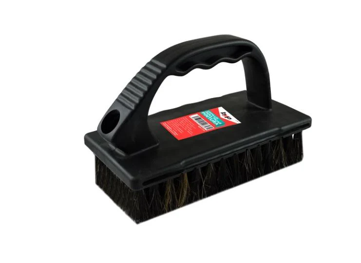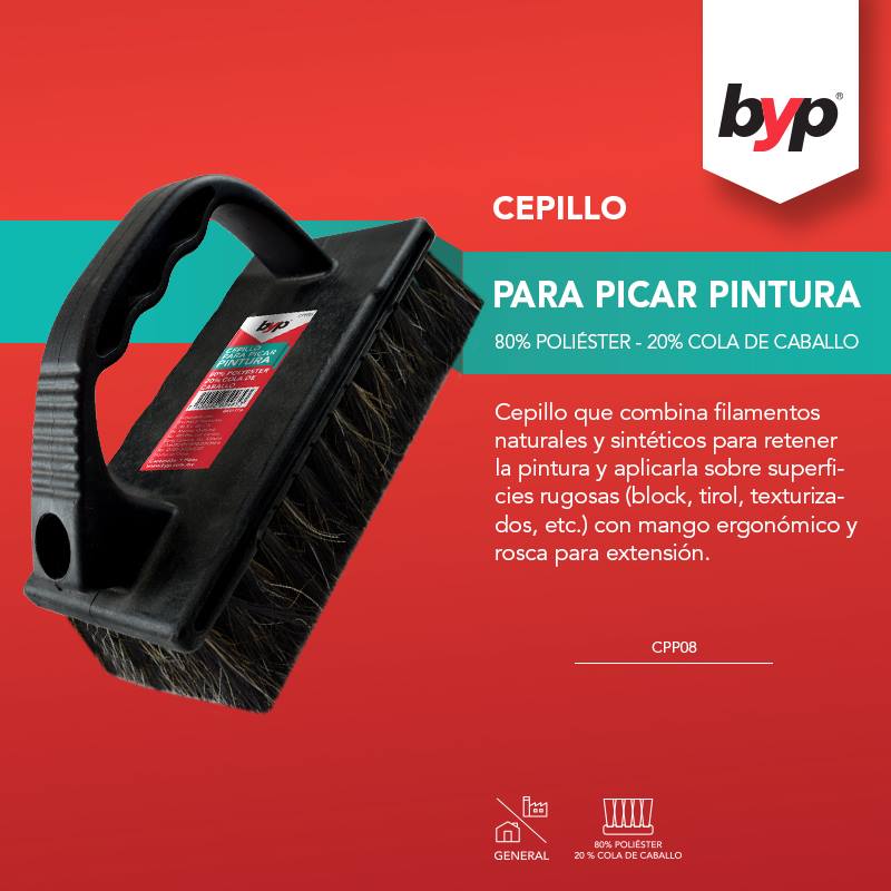 Cepillo que combina filamentos naturales y sinteticos para retener la pintura y aplicarla sobre superficies rugosas (block, tirol, texturizados, etc.) con mango ergonomico y rosca para extension.