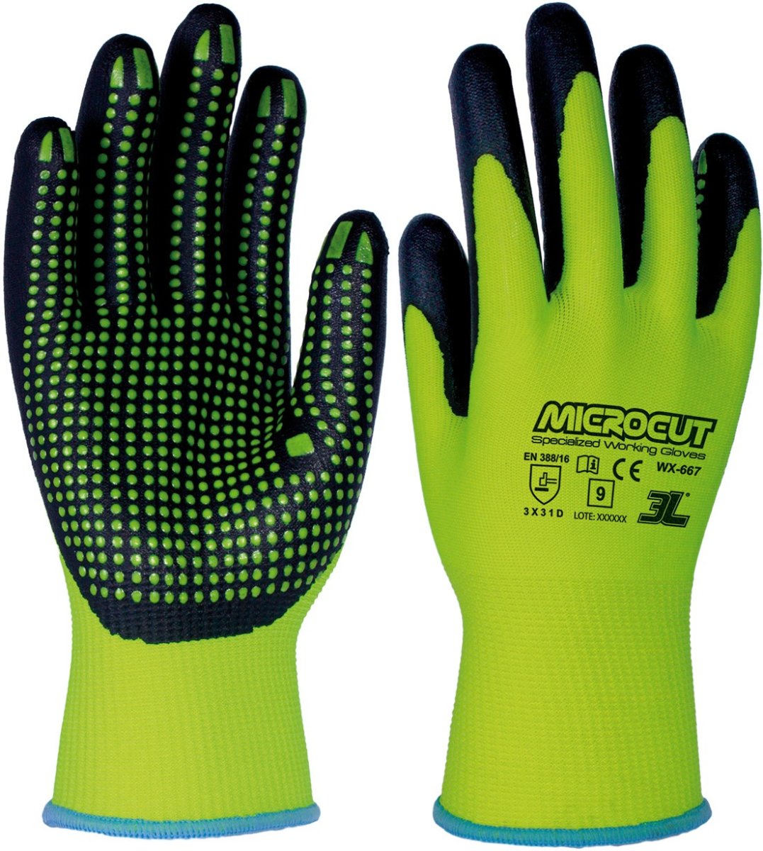 Guante de poliéster, fibra de vidrio y elastano con nitrilo foam y dots de nitrilo.