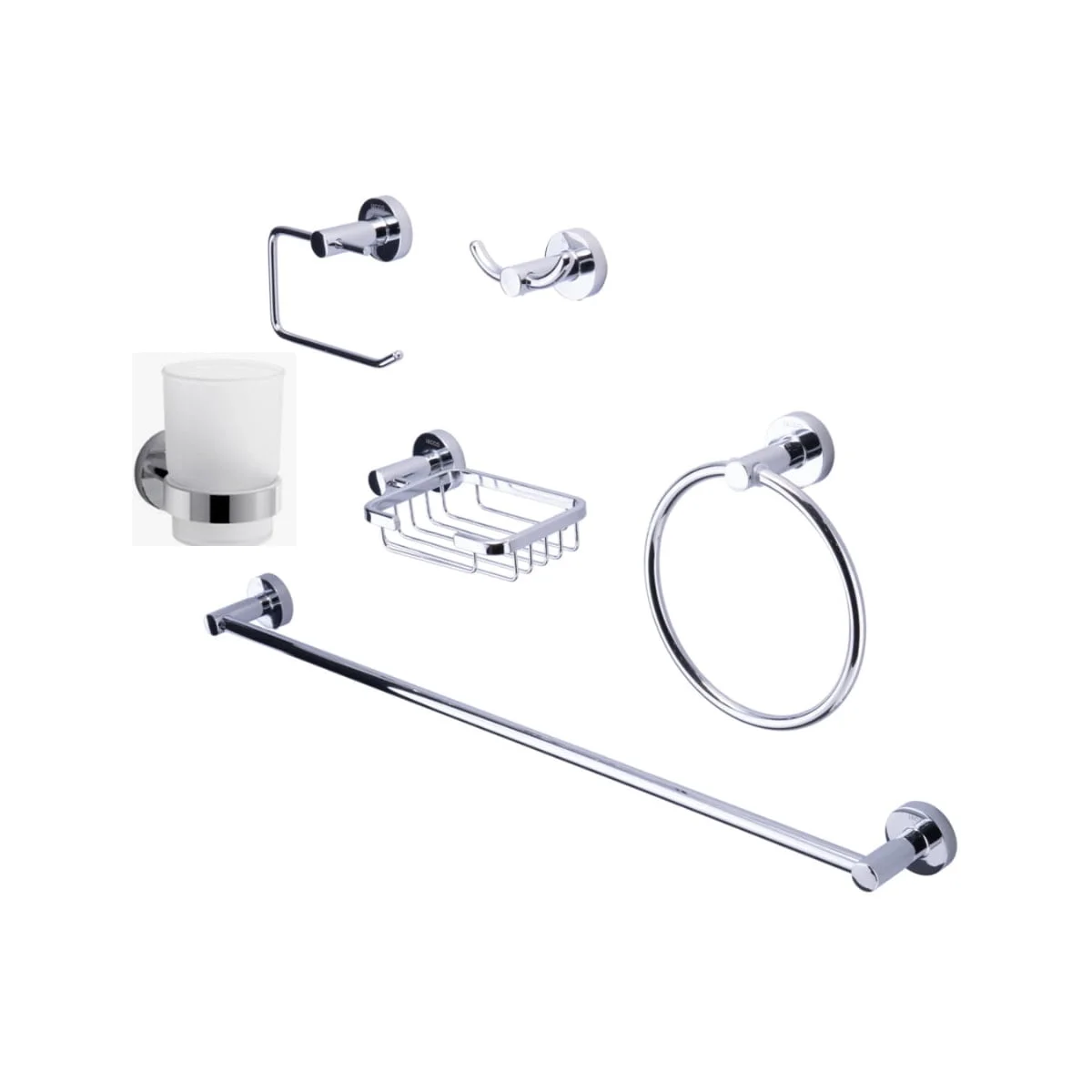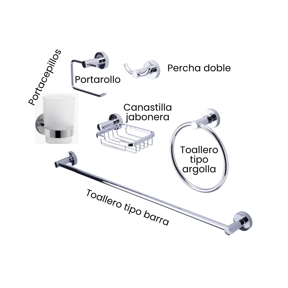 Este juego incluye todo lo necesario para organizar tu baño de manera eficiente: un toallero, portarrollos, jabonera, gancho y una repisa. Cada pieza cuenta con un acabado en cromo pulido, lo que le proporciona un brillo duradero y una apariencia sofisticada que se adapta a cualquier tipo de decoración.