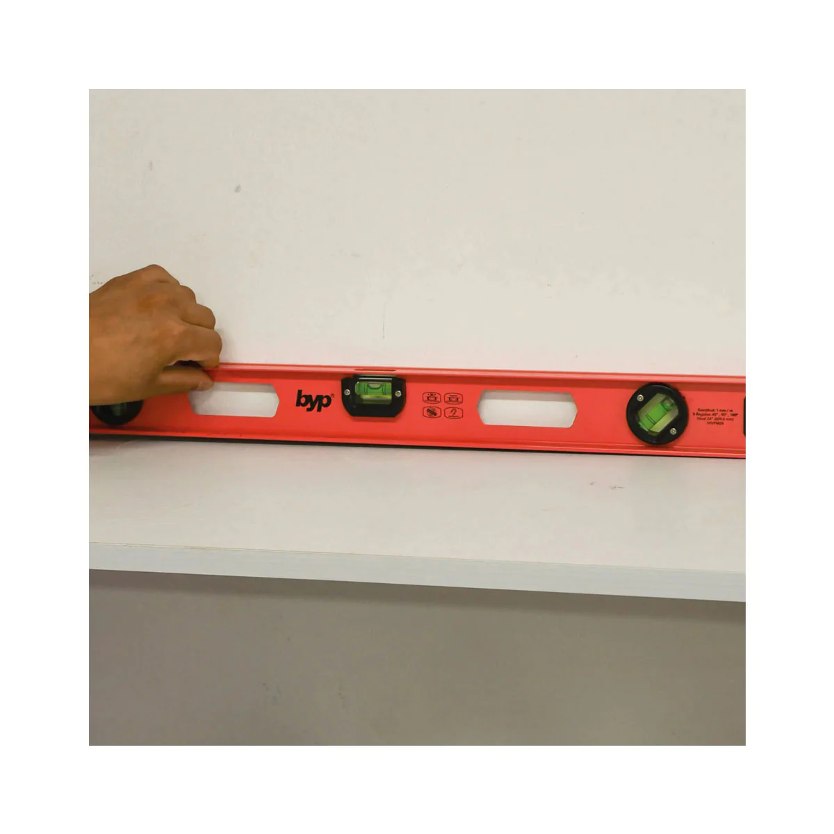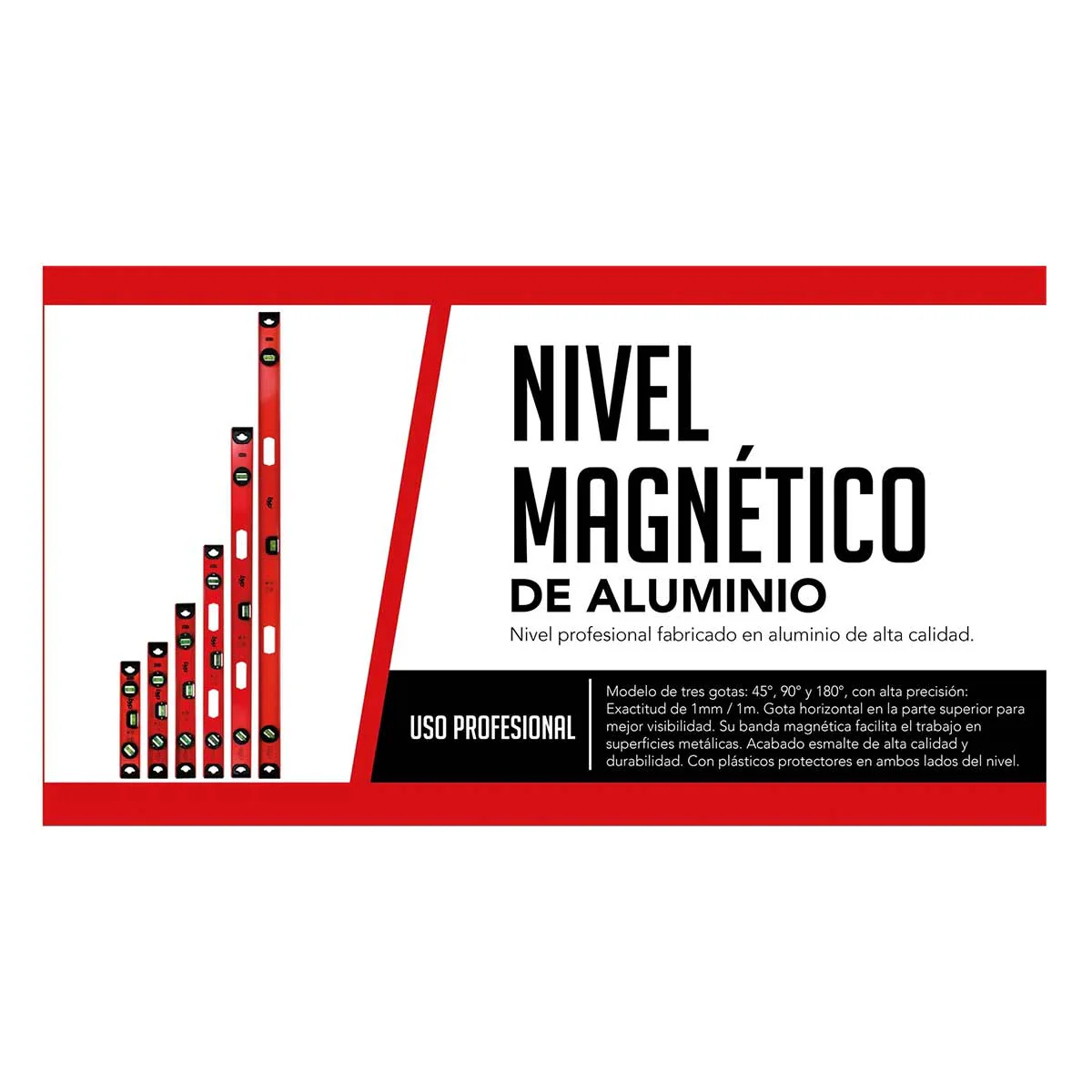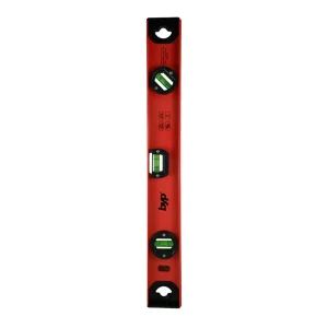Nivel profesional fabricado en aluminio de alta calidad, diseño en forma de I . Frascos de alta precisión garantizada por control numérico en el proceso. Gota horizontal en la parte superior que facilita su visibilidad, con banda magnética en uno de sus lados. Este modelo cuenta con 3 gotas de 45°, 90° y 180°. Acabado en esmalte de alta calidad, durable y resistente a los golpes. Con plásticos protectores resistentes a los impactos en ambos lados.