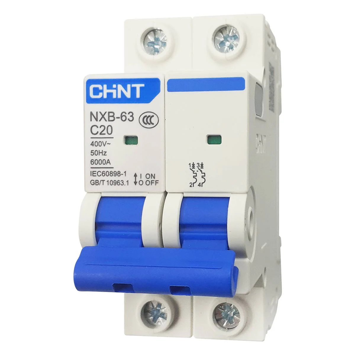 Interruptor termomagnético de la serie NXB-63 C tipo riel din de 2 polos 20 amperes de la marca Chint; es el dispositivo ideal para el hogar, industria o comercio, protegiendo las instalaciones eléctricas y sus receptores frente a sobrecargas y cortocircuitos eléctricos, siendo capaces de suspender el paso de la corriente eléctrica en un circuito al detectar una sobrecarga (parte técnica) o una sobretensión (en parte magnética).