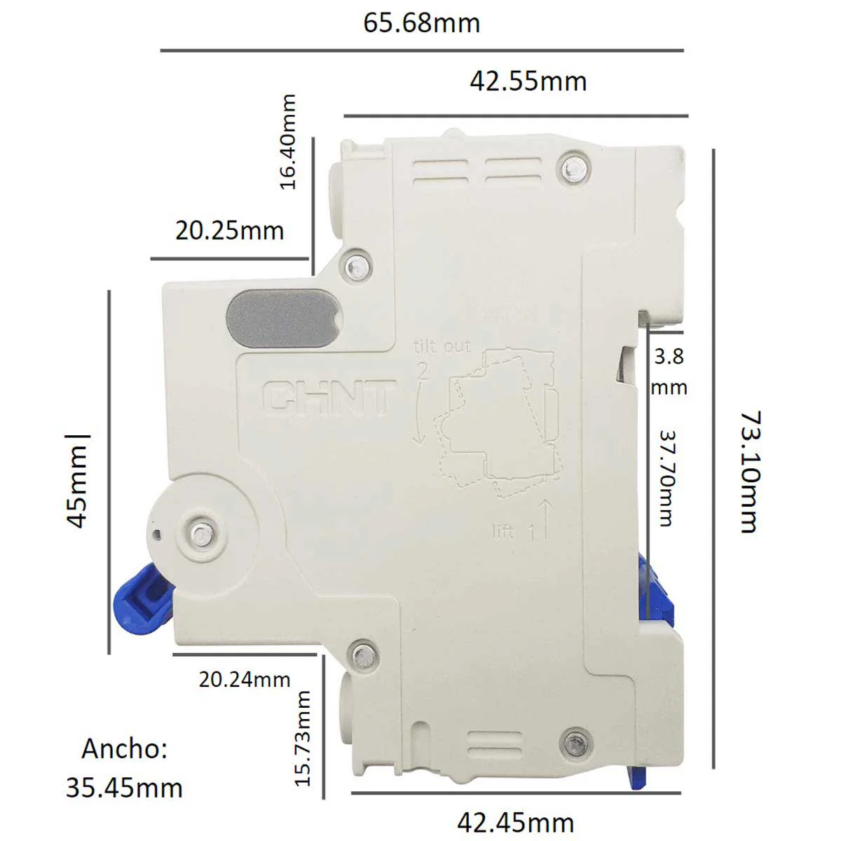El interruptor termomagnético cuenta con una bandera indicadora que ofrece señalización visual del estado y función del dispositivo, el color rojo indica un circuito cerrado y el color verde, un circuito abierto. Fabricados bajo el estándar IEC/EN60898-1 con certificados CE y NOM, e ISO: 9001 ISO: 14001, ISO:45001.