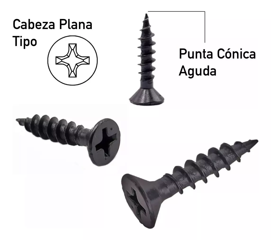 Tornillo Pija Aglomerado de Cabeza Plana Tipo Phillips con Nibs, cuenta con recubrimiento de fosfato negro que los hace más resistente a la corrosión, por lo que tienen una alta durabilidad. Perfectos para construcciones, placas de yeso, paredes de yeso, paneles de madera, escaleras y otras aplicaciones de interior y exterior. Gran variedad de medidas disponibles para todo tipo de trabajo de carpintería.
